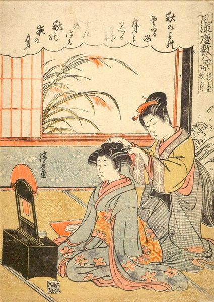 This ukiyo-e woodblock print by Kitagawa Utamaro captures a lively scene on a bridge, bustling with figures in a serene, watery landscape. The attire of the figures, their hairstyles, and the presence of a sake pot offer insights into the customs of the Edo period. Observe the intimate gesture of one figure adjusting another's hair. Throughout art history, the act of grooming has symbolized care, affection, and social bonding. Recall ancient Greek frescoes depicting similar acts of personal attention. The motif transcends time, yet its emotional resonance remains constant. Such gestures remind us that while eras may shift, the human capacity for empathy and connection endures. This image subtly explores themes of community, care, and the quiet moments that define our shared experiences. These elements, deeply rooted in our collective psyche, continue to resurface, reminding us of the cyclical nature of human emotion.