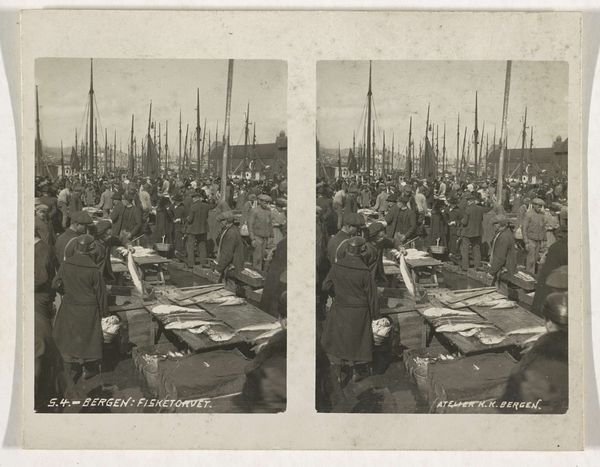 This photograph by Atelier KK captures the fish market in Bergen, Norway. At first glance, the eye is drawn to the scene's dense, almost chaotic composition, a sea of figures delineated in subtle shades of gray. Vertical lines of ship masts punctuate the skyline, creating a stark contrast to the bustling crowd below. The photograph invites us to consider the act of representation itself. Through a formalist lens, it's clear that the artist isn't just documenting a scene, but constructing a visual narrative. Semiotically, the repetition of figures and objects acts as signs, forming a language that speaks to the collective experience of the market. The high density of the crowd, rendered in meticulous detail, suggests the market's importance as a nexus of social and economic activity. The formal qualities of the work—its composition, tonal range, and spatial organization—invite ongoing interpretation, reflecting how a seemingly straightforward depiction can offer multiple layers of meaning.