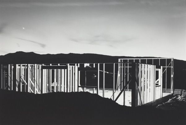 Curator: Robert Frank's "Spring," created in 1971, presents us with a layered gelatin silver print montage. Editor: My immediate reaction is one of disjointed nostalgia; it feels melancholic, almost like fragmented memories pieced together. Curator: Precisely. Notice the formal structure: it features what appears to be a framed montage, itself composed of sequenced photographs, hanging by clothespins on a line. The image disrupts any straightforward reading by placing a meta-image—art within art—before the viewer. Editor: The clothespins and the note hanging alongside contribute so much, too. They evoke the mundane, a casual snapshot into a deeply personal process, a deliberate unveiling of his creative act. It breaks the pretense, doesn’t it? Spring usually symbolizes rebirth. Why so much grey and a rather bleak mood? Curator: Spring, yes, is suggested by the title but it might also be taken ironically. Consider the landscape within the montage: horizontal bands of gray skies and hazy water lines that intersect to create disorienting depths of field and tone. These visual elements emphasize a stark contrast to traditional spring imagery; thus this is about visual sensation and experience, but subverted. Editor: That gray… it's overwhelming. We can feel an emotional connection to Frank's feelings about renewal. Do you think that landscape is one he saw during springtime? Or could "spring" be less about the time of the year, but rather, evoking the metaphor of mental renewal following hardship or crisis? Curator: That would require understanding more about Frank’s intentions or accessing some contextualization behind this specific montage series from that year… the landscape in any case seems like the container in which these layered narratives take root. Ultimately this challenges our desire for resolution. We do not resolve everything into one narrative space. Editor: True, it seems like the "Spring" it portrays is about unresolved emotions. It also questions how artists reflect emotional seasons via images, as metaphors or lived truths… Curator: A fascinating image for how it makes us work to see what is and perhaps what isn't—making form a vehicle for deeper inquiry. Editor: Yes—and through Frank’s innovative and daring spirit, he transforms an everyday object like a photograph into a testament about feelings on a landscape we only feel with him, rather than see by ourselves.