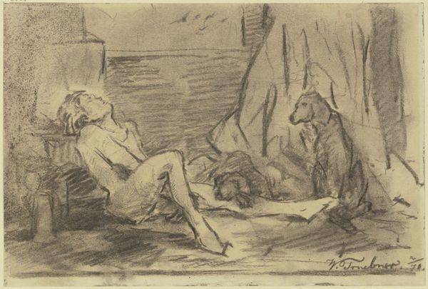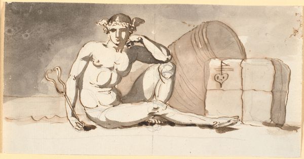 Curator: Nicolai Abildgaard's "Draft for a Doorway. Sleep, a Reclining Female Figure with a Small Child and a Lion at her Right Side," crafted between 1743 and 1809, is executed with ink and watercolor. Editor: My initial impression is one of languid grace and guarded rest. The tonal range is subdued, which reinforces the thematic representation of sleep, but what really draws my eye is that striking juxtaposition of softness and implied power. Curator: Absolutely. Compositionally, Abildgaard orchestrates a balanced tableau. Notice how the horizontal repose of the woman mirrors and contrasts with the compact form of the lion, both anchoring the visual field. The textural nuances—the fluid drapery, the bristling mane—create a rich surface tension. Editor: Symbolically, it’s rich! The lion—often an emblem of courage and vigilance—becomes here a protective guardian of slumber, which introduces that compelling tension between vulnerability and strength. The sleeping woman herself suggests not just rest but also perhaps the wellspring of creative inspiration. What kind of iconographic work was Abildgaard engaged with here? Curator: Indeed. This piece resonates deeply within the framework of classical and romantic allegories. The posture and garments invoke classical antiquity, which at the time represented virtue, while the use of watercolour, particularly with these blurred, less defined elements around the forms introduces Romantic emotionality and subjectivity into the visual form. The relatively undefined treatment of what might be foliage in the background invites individual reflection, eschewing dogmatic statements. Editor: Considering its context as a door piece, I’m compelled by how sleep and dreams function as thresholds to other realms of consciousness, memory, perhaps even the divine, a visual invitation into a specific interior state. That lion feels critical as an active rather than passive guardian on that precipice. Curator: Fascinating perspective. Ultimately, I see a study of intertwined motifs. Abildgaard's technical approach serves less to depict the allegorical scene in strict representation, and more to express these ideas—strength, and vulnerability. Editor: Yes, a complex meditation on guarding rest, where dream invites strength, but also depends on the constant vigilance of waking forces. It gives us much to ponder!