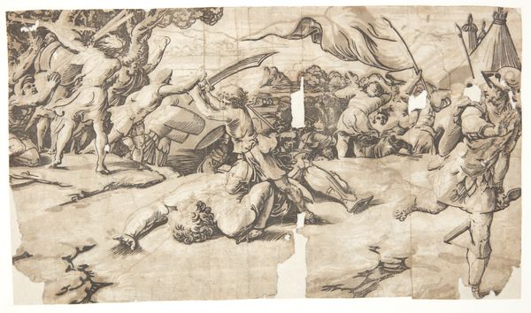 Curator: Immediately striking is the dynamism conveyed in this seemingly preliminary drawing. Editor: Yes, there is a distinct tension in its layering, like memories half-recalled, particularly resonant figures of captivity and domination. Tell me more about the artwork. Curator: This is “Fragmentarisk blad med elementer fra en loftsdekoration”, rendered in pen and ink, its creation attributed to an anonymous artist sometime between 1600 and 1700. We’re fortunate to have it here at the SMK, Statens Museum for Kunst. The Baroque sensibility is readily apparent. Editor: The way that the figures cluster recalls that period, particularly the muscularity of some of them, but even these robust bodies are bound in subordination, the chained figure on the lower left contrasts dramatically with the Mercury figure presiding overhead. Curator: Indeed, and consider the spatial relationships, that tension of forms pressing against one another, a formal strategy the Baroque masters employed to engage the viewer actively. Also the line weight variation generates remarkable depth in areas of such limited contrast. Editor: The symbolic weight is significant here. The juxtaposition of figures, with implied narrative involving slaves, powerful men and the divine overseeing—a micro-cosmos mirroring the macro-cosmos, each operating through systems of control and reward. What purpose may such potent allegorical image serve? Curator: This seems a preparatory sketch. The drawing served as planning and testing ideas. As such the purpose isn't an ultimate statement on authority but testing compositions of authority figures to be realized elsewhere. The anonymous creator sought to hone not political view but aesthetic form. Editor: I find this all quite engrossing! Even what may simply appear as a rough study offers substantial meaning about not only power, but how humans, both as creator and viewer, organize and express these systems. Curator: And that speaks to art's power regardless of final form. We see these systems made formal through lines. Editor: Precisely. We look, decode, and interpret a web of meaning that is woven within the very structure itself.