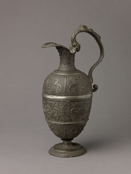 Curator: A fascinating piece before us today: a miniature silver kettle with a cover, crafted sometime between 1685 and 1715. It currently resides at the Metropolitan Museum of Art. Editor: It's…tiny! I’m immediately struck by the perfect scaling down of this Baroque-style decorative piece. The metal is beautifully distressed; each blemish carries the weight of years gone by. Curator: Absolutely. Its small scale perhaps hints at a specific function beyond the merely utilitarian. It might have been part of a larger, elaborate toy set, perhaps a status symbol for the children of the wealthy. Tea ceremonies and tea drinking, both in private and courtly settings, have very strong ritual dimensions, wouldn’t you agree? Editor: Definitely. The symmetry is delightful—a perfect, rotund body. Look at the handle attachments! Those vertical elements interrupt the curve of the handle itself and the rounded main form of the kettle in a sophisticated, unexpected way. The lid too has a beautiful hemispherical symmetry to the object’s overall geometry. Curator: Its silvery hue makes me think of moonlight on water, which makes it such a timeless symbol of serenity, almost transcending its obvious connections to the pleasures of its presumed patrons. It represents both luxury and domesticity. I'm wondering how the function is implied symbolically; one expects fire and heating for water, so where is the element of danger? Editor: Perhaps it speaks to controlled opulence—recreating a scene, devoid of any true danger or heat? The form evokes readiness, and its precious metal signifies controlled accessibility to warmth, friendship, and gathering, mediated via display and privilege. What stories it could tell, sitting there all gleaming... Curator: Indeed. It reminds us that even everyday objects can embody deep cultural meanings, social hierarchies, and symbolic power. The enduring significance of symbols—what remains relevant, what fades. Editor: For me, it’s a compelling exercise in form, scaling, material, and intentional, textural variation. Even something deemed merely "decorative" invites a powerful aesthetic experience.