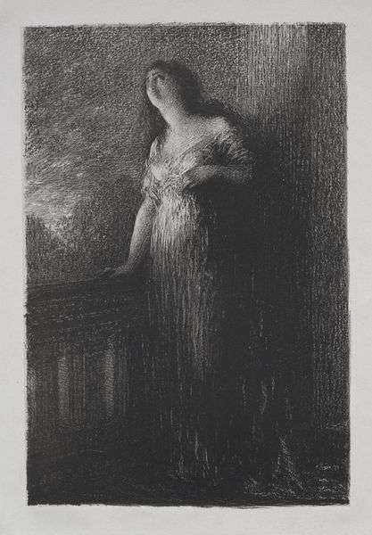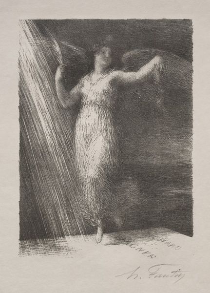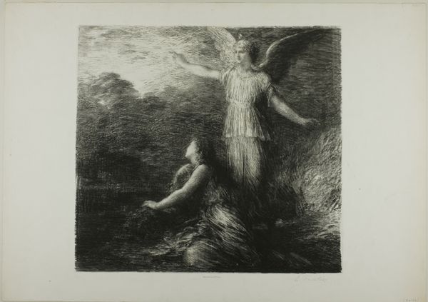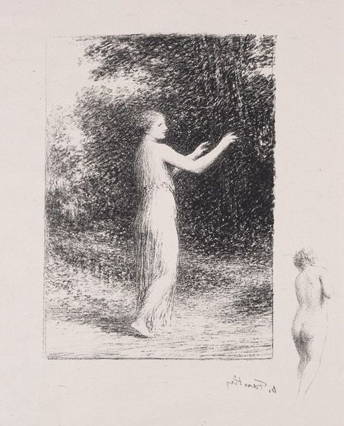 Editor: This is "La jeune Tarentine," created in 1903 by Henri Fantin-Latour, rendered in pencil and charcoal. It feels so ephemeral, almost like a dream. What strikes you about it? Curator: Immediately, the emphasis on process stands out. Look at the visible hatching, the layering of pencil and charcoal. This isn’t about illusionism, but about revealing the artist's labor, the very act of making. How does this choice of medium influence your understanding of the figure depicted? Editor: I hadn't thought about it that way, but now I see how the rough, almost unfinished quality adds to the dreamlike quality. Does that choice reflect anything about society at the time, or Fantin-Latour's place in it? Curator: Absolutely. Fantin-Latour was operating at a time when academic painting still held considerable sway. His choice to create a symbolic nude using humble materials like charcoal challenges that hierarchy. Consider, too, that the "nude" was a historically loaded subject – what is he communicating here with this approach? Is it about making classical ideals accessible, or subverting them altogether through his distinct style and emphasis on the materiality of the work? Editor: So, the work is not only portraying a figure, but also making a statement about artistic production itself, about craft. That's really interesting! Curator: Precisely. It elevates the act of drawing to a space previously held for paintings only, effectively disrupting traditional definitions of what constituted "high art". Hopefully now, considering materiality helps unlock broader readings. Editor: Definitely! It changes how I see the artwork. Thanks. Curator: Likewise. There is so much more to examine beyond the immediately visible.