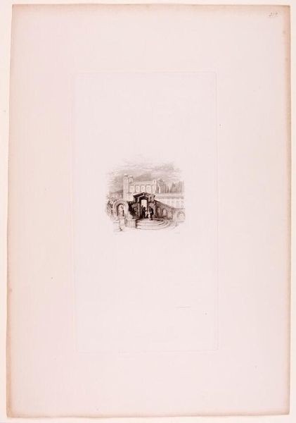 Editor: This is “Aosta” by Henry Le Keux, an etching from the Harvard Art Museums collection. It’s so delicate and small; what catches your eye? Curator: I see the echoes of classical grandeur contrasted with the human figures. The artist evokes both the enduring nature of Roman architecture and the transient nature of human life. Notice how the archway mirrors the mountains in the background. Editor: That's an interesting connection; I hadn't considered that. How does that mirroring contribute to the piece? Curator: It implies a continuity, a dialogue between human creation and the natural world. It's as if the mountains themselves are a cultural memory, witnessing the rise and fall of civilizations. Editor: I see now. So the landscape isn't just a backdrop, it is part of the story itself. Curator: Exactly! Le Keux is inviting us to contemplate our place within this larger narrative of time and place. Editor: This has given me a new way to think about how landscapes can communicate symbolic meaning. Curator: Indeed, the image lingers in the mind long after one looks away.