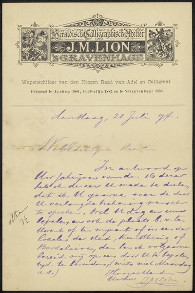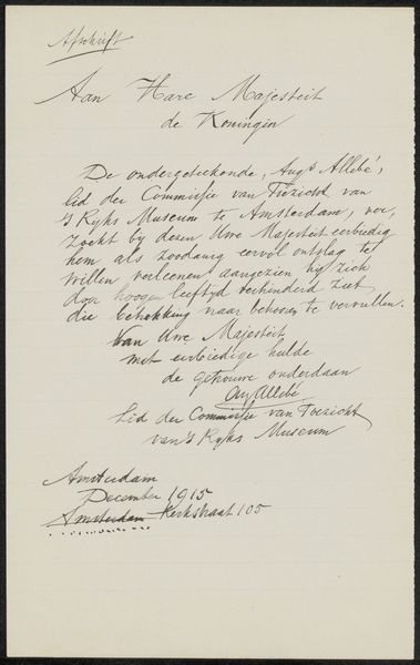 August Allebé crafted this invitation in Amsterdam in March 1915. The print has a rigid structure featuring multiple sections of text, each neatly demarcated and aligned. The text blocks are arranged to guide the eye downwards. Notice the calculated placement of the handwritten inscription, which deviates from the print's orthogonal geometry. It creates a subtle tension. This element can be seen as a disruption, challenging the fixed order of the printed text and adding an individual, human element to the otherwise formal announcement. The artist’s signature bridges the gap between the official printed content and a more personal, artistic expression, hinting at a dialogue between the realms of public communication and individual creativity. Consider how this interplay reflects broader cultural dialogues about the role of art in shaping public discourse during the early 20th century. Remember, a work like this isn't just an historical document; it's a space where form and function meet, inviting us to interpret its signs and meanings.