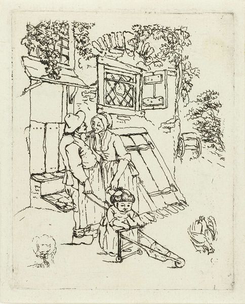 Wilhelm Marstrand sketched ‘Two Italian Women in a Doorway, One with a Distaff’ using graphite on paper, resulting in an artwork dominated by line and form. The composition divides into distinct planes, foreground, middle-ground and background. Marstrand employs hatching and contour lines to delineate shapes and suggest depth. The contrast between the dark, dense marks forming the doorway and the lighter touches that give shape to the women's clothing and faces, creates a visual hierarchy. The figures are framed by the architecture, and a large vase serves as both a structural element and a focal point. The sketchy quality adds a sense of immediacy, capturing a fleeting moment. Yet, beneath this impressionistic surface, we find a carefully structured arrangement, reflecting Marstrand's training. The drawing functions not merely as a record of observation but as an exercise in visual organization, where line and form collaborate to produce a scene both intimate and formally rigorous.
