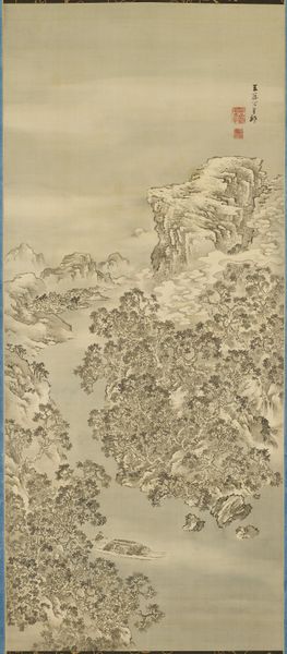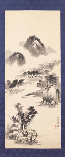 Okada Beisanjin made this scroll painting, "Landscape with a Pavilion," using ink on paper. Though these materials seem simple enough, the artist’s skilled manipulation of them yields impressive results. The monochromatic ink creates a range of visual textures, defining the mist-shrouded mountains and the dense foliage surrounding the pavilion. The artist has meticulously controlled the ink’s consistency and application, moving from diluted washes for the background to concentrated, precise lines for the foreground details. Notice how the ink bleeds slightly into the paper's fibers, softening the forms and enhancing the ethereal quality of the landscape. Consider also the social context of literati painting, of which Okada was a master. Such works were not just aesthetic exercises, but demonstrations of cultural refinement and scholarly achievement. The act of painting was itself a form of labor, demanding years of disciplined practice. The finished work embodies both artistic skill and intellectual depth. Appreciating the labor and skill involved allows us to move beyond seeing this as a simple landscape, and to consider the broader cultural values it embodies.