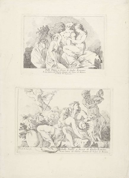 Editor: Here we have "Diana vraagt Jupiter om eeuwige maagdelijkheid," which translates to "Diana Asks Jupiter for Eternal Virginity," an engraving made sometime between 1803 and 1840 by Charles Pierre Joseph Normand. It’s Neoclassical in style, with an interesting focus on line. The whole image feels very formal and a little distant, maybe? What are your initial thoughts about this print? Curator: Ah, yes, this print. Immediately, I’m struck by the starkness of the line, that almost chaste quality it lends. It reminds me of a particularly crisp dream, doesn't it? All classical composure hiding the subconscious bubbling just beneath the surface. You see Diana, strong, resolute, appealing to Jupiter…but consider those bas-reliefs at the bottom. Figures caught in languid poses, hints of sensuality. It's as if Normand is juxtaposing the ideals of Neoclassicism with the messy realities of human desire. Do you think that contrast was intentional, or is it merely a product of the style? Editor: That’s a great question! I hadn't really considered the bas-reliefs in relation to the main scene, but now that you mention it, they do seem to offer a contrasting perspective, maybe a grounding of the divine in something more earthly? Curator: Exactly! Perhaps it's about showing the tensions inherent in striving for an ideal, the eternal push and pull between control and abandon. Art, at its best, isn't about answers, is it? It's about holding up a mirror to the questions we keep asking ourselves, and allowing the contradictions to exist within the same frame. Editor: This has opened my eyes to viewing art and the tensions art holds, thanks! Curator: My pleasure; I guess the real fun starts when you discover how the artwork speaks to you.