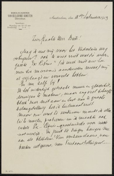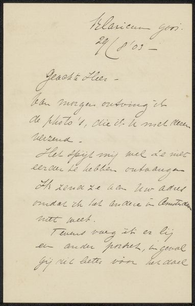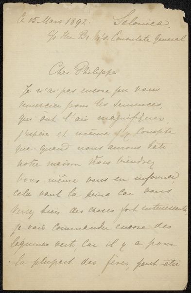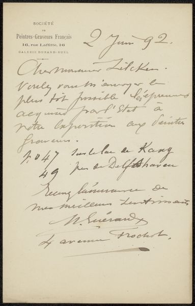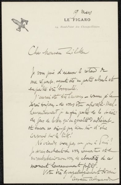 Editor: Here we have "Brief aan Philip Zilcken," which translates to "Letter to Philip Zilcken," a pen and ink drawing on paper by Arsène Alexandre, created before 1897. It’s at the Rijksmuseum. The handwritten quality gives it an intimate feel, but what can you tell me about its artistic qualities? Curator: Certainly. Notice first the application of the ink; Alexandre uses its varying densities to create visual weight and rhythm across the page. This careful distribution of dark and light shapes, though functional as text, creates an abstract pattern independent of its meaning. Consider, also, how the negative space surrounding the script affects the overall composition. Editor: So, you are focusing more on the shapes and lines than on the text itself. It's interesting how that shifts the perception. What do you think Alexandre was trying to convey with that kind of approach? Curator: While the literal message undoubtedly holds value, to isolate and analyse its visual structure encourages us to consider the act of writing itself. The flourish and form speak to the emotional connection and artistic sensibility infused within this simple correspondence. Editor: That reframing is insightful. I was initially caught up in deciphering the handwriting, but now I see it as a study of form, an almost calligraphic exploration of penmanship itself. Curator: Precisely. Recognizing these formal elements elevates it beyond the mundane and reveals Alexandre's attention to line, texture and visual balance within the context of something as ordinary as a personal letter. Hopefully, the formalism that can be extracted from the elements employed by the author. Editor: I appreciate you pointing that out, looking at this as shapes instead of just text definitely reframes the piece for me. Thanks for sharing your expertise.