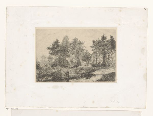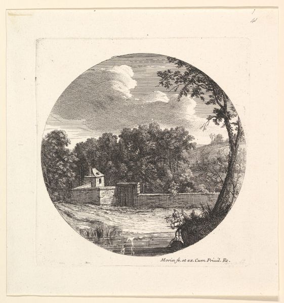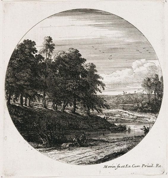 Editor: This is Jean Morin's "L'Enclos", an etching dating from between 1605 and 1650. It's a small, circular landscape, almost dreamlike. What stands out to you in this piece? Curator: The circular frame immediately makes me think of a hidden world, a secret garden almost. Notice how the etching focuses on a river enclosed by a dense line of trees. This imagery, especially given the period, could symbolize refuge or sanctuary. Editor: That’s interesting! Refuge from what, specifically? Curator: Perhaps from the religious conflicts brewing across Europe. Landscapes weren't just pretty pictures, they could also evoke specific emotional and psychological states. The density of the trees acts almost as a protective barrier, wouldn't you agree? It makes you feel almost… safe. Editor: Yes, the trees definitely create a feeling of enclosure. Is the river part of that symbolism as well? Curator: Rivers have long been associated with journeys, both literal and metaphorical. The fact that figures are present in the lower section of the landscape may imply ordinary tasks completed in safety, protected from whatever is beyond that boundary line. It could indicate freedom of the ordinary man. Does it evoke any particular cultural memory in you? Editor: I see what you mean! Thinking about it now, it makes me consider those classical paintings where the natural world represented a Golden Age. Curator: Precisely. So you can begin to unpack the continuity of themes – that longing for an idealized, peaceful existence. Art constantly echoes art; artists build from pre-existing images to develop ideas, and the symbolic becomes part of the cultural consciousness. Editor: This really opened my eyes to how much depth landscapes can have! Curator: Mine as well! Now I am eager to research where "L'Enclos" truly resides.