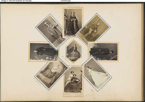 Editor: Here we have *The Madame B Album* from around the 1870s by Marie-Blanche Hennelle Fournier. It's an albumen print, comprised of many photos. It strikes me as quite playful, almost absurd, with all these regal-looking cats. What's your take on this curious collection? Curator: Well, let's think about what it *means* to produce an image like this in the 1870s. Albumen prints were meticulously crafted. It's not a quick snapshot. Someone invested considerable labor in capturing and arranging these cat photographs and emblems, like those little flags. Editor: So, you’re focusing on the labor behind it? Curator: Precisely. Think about the socio-economic context: who had the leisure time and money to engage in such a project? This album speaks volumes about class, labor and the material culture of the bourgeoisie in the late 19th century. Editor: That makes sense. The cats are arranged like heraldic symbols almost, giving the album this air of noble…feline-ness? Curator: Consider also, the act of photographing animals itself. Was it a means of exercising a degree of control over nature through this technology? The production of such images certainly reveals a specific relationship with the animal world at the time. Do you think there's something beyond just mere "playfulness"? Editor: I see what you mean. Thinking about the effort and context transforms my understanding. The image isn't simply cute cats, it represents status, production, and even power relations through material representation. Thanks, that really changed how I see it! Curator: Exactly! Considering the materiality of the artwork opens up all sorts of questions. Now we can appreciate how processes shape what we perceive.