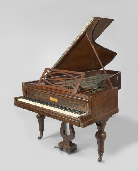 Curator: Here we have a Grand Piano, crafted by John Broadwood & Sons in 1827. It currently resides at the Metropolitan Museum of Art. Editor: What immediately strikes me is its commanding presence—the sheer geometry of the instrument set against that ornate wood carving, a real tension of form. Curator: It is quite striking. Musical instruments in this era often symbolized status and refinement, acting as a focal point for social gatherings. The piano, in particular, became a centerpiece for domestic life, embodying education and artistic cultivation. Editor: Indeed. Notice the mahogany; the grain practically vibrates. Then consider the carefully considered placement of the decorative flourishes; they don't overwhelm the eye but subtly guide it. The line work is precise. Curator: The lyre-shaped pedal support is particularly interesting. The lyre has ancient roots, deeply embedded in Greek mythology, as a symbol associated with Apollo, music, and poetry. Its incorporation here speaks volumes about the cultural aspirations of the piano's owner. Editor: An astute observation. Speaking formally, the dark hues lend it an air of gravitas, even mystery. Imagine the play of light across those surfaces in a dimly lit parlor—it practically begs for sonatas to be played! Curator: Precisely. Romanticism placed a strong emphasis on emotional expression, the sublime, and connecting with nature. Owning an instrument capable of producing such emotionally resonant sounds served as a means to channel these beliefs and values into daily life. Editor: Ultimately, an object like this speaks not only to artistic tastes, but to the performance, skill, and presence of mind necessary to fully actualize its intended function. There is a whole unspoken language embedded within its surfaces. Curator: And it reveals the symbolic interplay between aspiration and identity, connecting to broader societal currents through sound and style. Editor: Exactly. Now that I've really looked, the craftsmanship gives a voice to the era.
