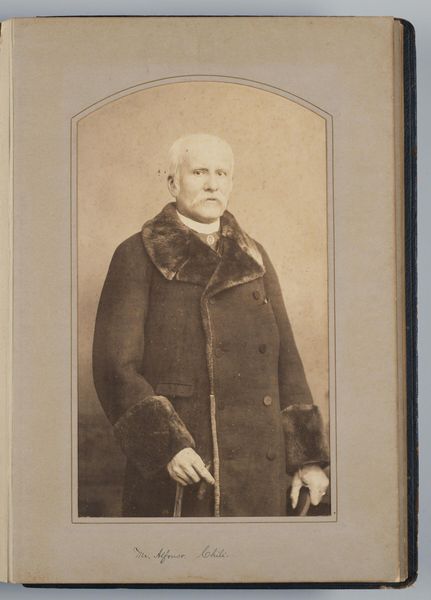 Editor: Here we have Mathew Brady’s portrait of Jacinto Castellanos, a Salvadorian delegate. The sepia tones give it such a classic feel. What visual elements stand out to you? Curator: The composition, with Castellanos positioned centrally, commands attention. Note the careful distribution of light and shadow, sculpting form and highlighting textures within the constraints of monochromatic photography. Do you observe how the tailoring of the coat and the angle of the umbrella create implied lines and geometric forms? Editor: I see it now, the angles do add another layer to the composition. Thanks! Curator: Indeed, further study of the image’s material presentation within the album offers additional avenues for discourse.