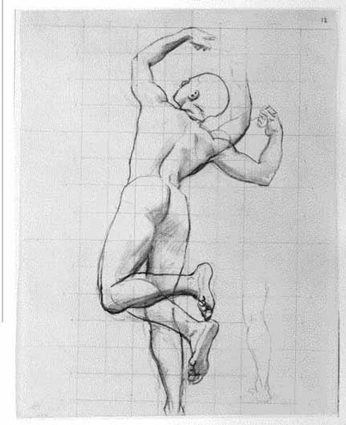 Editor: So, this is John Singer Sargent's study of a male nude, which was made for a decorative relief panel. It's just a pencil drawing, but the pose is so dynamic. How do you interpret this work, considering its role as a preliminary study? Curator: It feels almost like a captured moment, doesn't it? Sargent's quick, confident lines give the figure a sense of potential energy, like he's about to spring into action or... perhaps he's falling? Do you see that tension? It's a study, yes, but it's alive with possibility, a whispered prelude to something grander. Editor: I can see that! I hadn't thought about the "falling" aspect, but now it seems clear. Curator: It makes you wonder about the final staircase panel and how this figure ultimately found his place, doesn't it? Editor: Absolutely! I will remember that art can hide different possibilities.