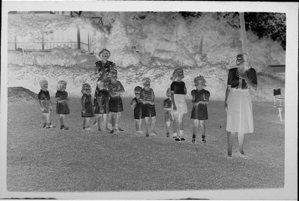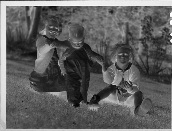 Curator: This photographic print, whose creation is attributed to Lucian and Mary Brown, presents children engaged in a game of blind man's bluff. Editor: It's eerie, isn't it? The stark contrast and the children's obscured faces give it a strangely unsettling feel, like a memory fading. Curator: The game itself is quite old; variations appear in numerous cultures. It's interesting to consider how play, even in a seemingly simple game, reflects social dynamics and perhaps, anxieties. Editor: Blindfolds are very symbolic. They represent not just the game here, but also ignorance, vulnerability, and perhaps a sort of forced innocence. The group dynamic adds to it - who gets chosen, who is left out? Curator: Indeed. And consider the context – a time when childhood was increasingly romanticized, yet also subject to stricter forms of social control. This image captures that tension, that duality of freedom and constraint. Editor: It leaves me wondering what kind of childhood they experienced, and what these children might have believed in.