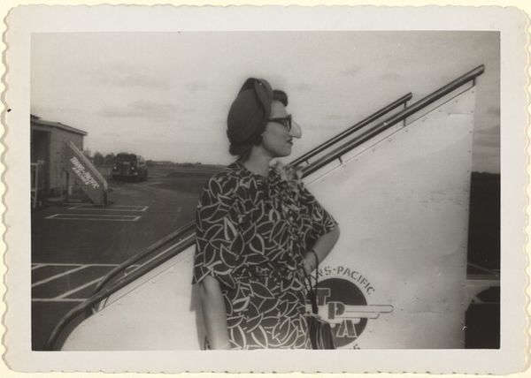 Curator: "Waitress, Ventura Boulevard--Los Angeles," a 1956 gelatin silver print by Robert Frank. It’s fascinating, capturing a fleeting moment in what seems like an everyday setting. I’m struck by how the starkness of the black and white gives the photograph such a direct, unadorned feel. How do you interpret the composition? Editor: The high contrast definitely adds to the feeling that this is such a decisive moment, and the subject's almost framed by that geometric divider. It feels very considered for what appears to be a casual snapshot. What formal elements do you find most compelling in this image? Curator: Note how Frank utilizes the grid formed by the window panes and the framing architectural elements to create a fragmented, almost cubist, space. The subject's face, while centrally located, exists within this constructed framework. How does the tonal range impact your reading? Editor: It adds so much, emphasizing textures and lines. The softness of the waitress’s features stands in contrast to the harsher geometry of the diner around her. But where is he focusing my attention? It's not a pure portrait, and not quite street photography either. Curator: Precisely! This tension is critical. Frank disrupts easy categorization. The luminescence on the subject is framed and contrasted against strong lines that guide the viewers eye and reveal, as well as obscure. Consider the surface quality of the print itself—its grain and subtle variations. Editor: So it's not just about capturing an image, but also the materiality of the photographic process. That actually makes so much sense and has completely changed how I'm reading the picture now. I’ll definitely pay closer attention to the materiality in photos going forward! Curator: Wonderful! It’s this interplay between subject, structure, and medium that makes Frank's work so resonant. Always consider the photograph as an object, not merely a representation.