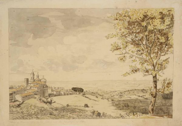 Editor: Here we have Alexander Cozens' "A String of Camels in Front of a Desert Fort." It feels like a scene from a dream, almost theatrical. What do you notice about the cultural context depicted here? Curator: It’s fascinating how Cozens, who never actually traveled to the East, constructed this image. How does the romanticized orientalism of his time affect our reading of this scene? Editor: So, it's more about European perception than accurate depiction? Curator: Precisely. The “desert fort” becomes a stage for European fantasies of the exotic, and the camels... mere props. Does this awareness change your initial impression? Editor: Definitely. I see now it's a performance of the "Orient," designed for a specific audience. Curator: Exactly. Understanding the politics of imagery allows us to critique the power structures embedded within seemingly innocuous scenes. Editor: That's a great perspective; I hadn't considered it that way before.