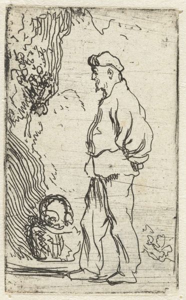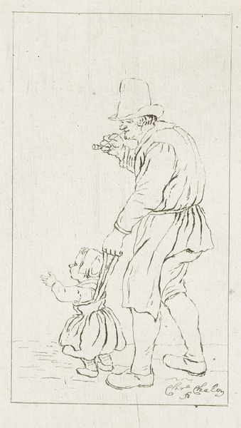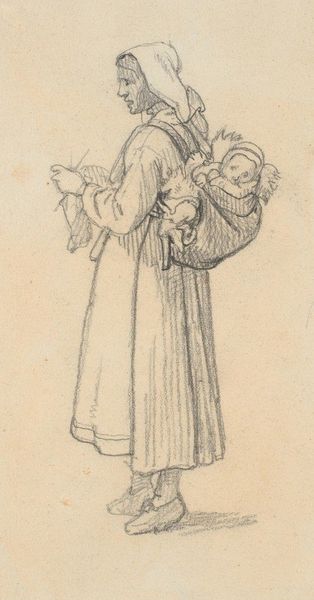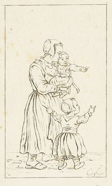 Curator: Here at the Rijksmuseum, we have Christina Chalon's evocative drawing, "Moeder met kind," which translates to "Mother with Child." It's rendered in ink on paper and believed to be created sometime between 1758 and 1808. Editor: It’s interesting. I’m immediately struck by the mother’s averted gaze. Her body language exudes fatigue, but the way she securely holds the crying child conveys such tenderness despite the difficult moment. Curator: The image of a mother and child is, of course, a recurring and potent symbol across cultures and religions. Here, Chalon presents a very intimate genre scene, stripped bare with minimal ink strokes that highlight their close, connected pose. Consider the simple dress and head covering; this wasn't meant to depict royalty but everyday life. Editor: It is such an everyday moment—a mother consoling her child. This work feels incredibly human in its representation of labor, familial expectations, and likely the lack of social safety nets to ease these burdens. Look at her worn shoes. I am drawn to her gaze. I'm assuming her exhaustion in this drawing reflects a wider reality of 18th-century gendered expectations in the Dutch lower classes. Curator: Absolutely. And within the Christian tradition, a mother holding a child always invokes a direct visual and historical link to depictions of the Virgin Mary holding the Christ Child. While seemingly domestic, these Madonna paintings portray women in their unique and significant social and spiritual roles. This piece reflects Chalon's mastery of using few lines to show emotional depth. Editor: The simple fact that this artist documented such an image and that it was selected for posterity makes me think of the political valence inherent to everyday portraiture. In whose image do we see a value and truth? We still battle the exclusion of poor or working class bodies from institutional fine art collections. This is more than just the aesthetic exercise. Curator: Seeing "Moeder met kind" through the lens of social narratives invites critical engagement with artwork that challenges the traditional canon, don’t you think? The potency of motherhood is more than simple love. Editor: Absolutely, yes. And in today’s contexts it's more relevant than ever. It’s images like these that can really shift our collective visual culture.