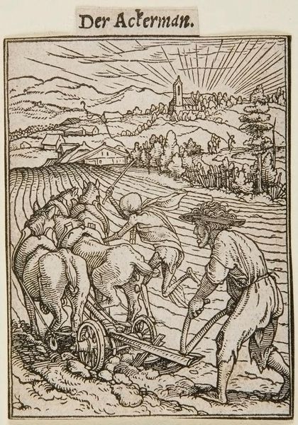 Curator: Before us is Hans Holbein the Younger’s woodcut, "The Ploughman," also known as "Boer en de Dood" from between 1524 and 1538. Editor: It strikes me immediately as both stark and vital. The heavy lines carving out this rural scene – death seems almost a part of the process, certainly present. Curator: Indeed. Holbein created a whole "Dance of Death" series, and this print powerfully reflects the widespread anxieties of the 16th century – religious upheaval, plagues, social unrest. It engages in the memento mori tradition so prevalent in the Northern Renaissance. Editor: I see how the symbolism of the plowman connects deeply to life's cycles – sowing and reaping, birth and death. The figure of death is fascinating; he’s driving the oxen and wielding a whip. It’s not just about death arriving; it's actively involved in labor. Curator: The "Dance of Death" was a popular theme, reminding people of death's inescapable presence regardless of status. Holbein’s work broke from traditional depictions by placing death within scenes of everyday life rather than some allegorical stage. It certainly reinforced social norms but equally acknowledged the disruptions. Editor: Observe how Holbein uses very simple shapes, to remind that everyone dies, no matter your origins, death always finds its way, notice the town in the background, representing the world we inhabit. How the dark figure leads to this image is central, the farmer has no control over its destiny. Curator: Holbein worked in a period when printmaking was rapidly developing. These affordable prints made art accessible to a broader public, spreading messages like this widely, influencing opinions and social conscience. The imagery reinforced both fear and piety. Editor: Looking at it through the lens of our time, this woodcut resonates with an ongoing human fascination with mortality. Even with technological advancements, the anxiety about death lingers. Perhaps its continual presence in art, even today, functions as a method for trying to gain understanding or simply cope with our mortality. Curator: It certainly shows the powerful link between art and society. Thank you for illuminating the symbolic context, offering fresh ways to view and connect with this piece. Editor: A pleasure. It's always striking how much these historical works can continue to converse with our current cultural consciousness.