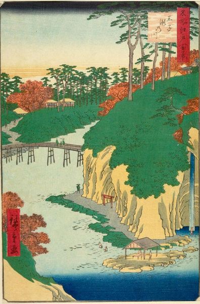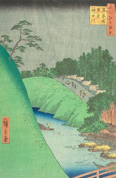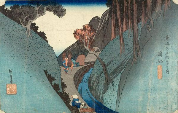Curator: Oh, I find this landscape so inviting! There’s something deeply comforting in Hiroshige’s perspective. Editor: Yes, that muted palette really sets a calm tone. You can almost feel the weight of those bundles being carried uphill. I wonder about the paper itself – the types available, the pressing and registration... Curator: I love how he captures the light filtering through the trees, it’s like a gentle embrace. But I wonder, does the composition suggest a kind of acceptance of hardship? Editor: I think so. These landscapes weren't just pretty pictures, they were documents of labor and trade. The materials employed would have been cheap, but it was skilled labor that transformed them. Curator: And in that transformation, the mundane becomes sublime. We see not just the journey, but the soul of the traveler. Editor: Right. It's a testament to the power of craft, of elevating the everyday. I'm now wondering about the distribution networks through which these prints circulated... Curator: It’s a good reminder that beauty can be found in the simplest things, even in the most ordinary of journeys.