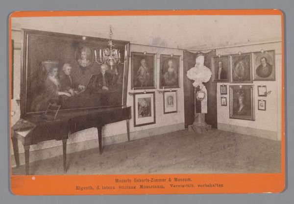 Editor: This is a photograph by Augusta Curiel, titled "Paramaribo, tentoonstelling van schilderijen en reproducties," taken around 1905. It depicts an art exhibition. I'm struck by how it captures not just the art, but also the act of viewing art at the turn of the century. What elements stand out to you most? Curator: Initially, the interplay of levels. The image is structured on horizontals: the table draped in cloth, the chair rail behind, even the implied horizon lines in the paintings themselves. Yet these are bisected by a series of emphatic verticals: the lines in the timber wall, the framed pictures hanging on them. What effect does that tension achieve? Editor: I guess it emphasizes the ordered nature of the display, while allowing for each artwork to be seen as distinct objects. Curator: Precisely. Note also the variation in frame styles, the arrangements of pictures stacked informally, salon style. Are the paintings subservient to the photography, or are they placed there to showcase the photographers skill? This could, in turn, mirror societal power structures present at the time. Consider, further, the textural contrast. Smooth paper photographs layered in front of rough timber wallboards Editor: I didn't even think about that layering when I saw it! Curator: Does this close-to-far arrangement generate meaning of any kind, do you think? Perhaps signaling to contemporary tastes, techniques? It’s a catalogue of pictorial grammars as well as a presentation of Curiel’s aesthetic decisions. Editor: This piece feels very meta. I went from thinking it was a snapshot of an exhibition, to realizing that is an artistic commentary in itself. Thanks! Curator: Indeed, a deceptively simple arrangement reveals a rather complex network of artistic and photographic vocabularies. Thank you.