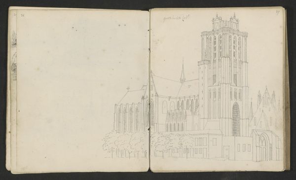 Cornelis Pronk’s delicate pencil drawing presents us with the Stadhuis te Middelburg, rendered with precision and care. The architectural study, displayed across two pages of an open book, is a symphony of lines, capturing the building's intricate Gothic details. Pronk’s choice to represent the building in this way evokes a sense of depth, even in the absence of colour. The composition’s visual effect is achieved through meticulous detail and scale; notice how the lines work together to create a harmonious balance, emphasizing the symmetry and proportion of the building. The drawing also functions as a historical document. Pronk’s drawing is not just a mere depiction but also an interpretation, filtered through his artistic sensibility and the architectural trends of his time. Consider, then, how the structure of the drawing—its lines, forms, and composition—interacts with the historical and cultural context of the building itself. This artwork provides insight into how we perceive, document, and assign meaning to architectural forms.