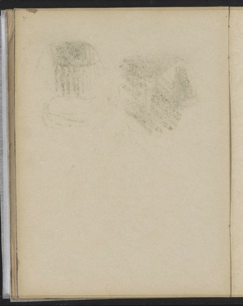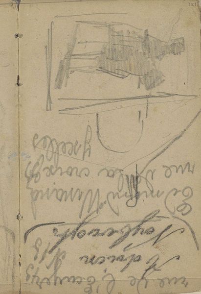 Curator: Here we have George Hendrik Breitner's "Annotaties," created between 1893 and 1898, currently housed in the Rijksmuseum. It's a portrait executed in pencil on what appears to be a page torn from a sketchbook. Editor: It feels almost spectral. The lines are so faint, it gives the impression of a figure fading, perhaps a memory or an idea barely captured before it vanishes completely. Curator: Precisely. Note the economy of line, the almost casual way in which Breitner defines form. The visible scribbled text in the background competes with the human form and contributes to the overall impression of impermanence. Editor: I am fascinated by this "impermanence". What can you say about the person in the image? I wonder about the circumstances under which the person sat for Breitner. Were they known to each other, was it a paid assignment or something less formal? Did the artist aim to capture some semblance of their reality and spirit? Curator: Knowing Breitner's penchant for capturing the hustle and bustle of Amsterdam life, I suspect the sitter was just a face glimpsed amidst the urban landscape. The quick, gestural strokes suggest this was a study jotted down rapidly, a fleeting impression. The use of a humble medium contributes to its spontaneous quality. Editor: The sitter is cloaked and has their head covered which obscures gender; the rapidness almost certainly contributed to erasing an expression as well, thus adding an anonymity to their features and identity, which perhaps further hints at the lack of care or even lack of humanism imbued within such drawings. Curator: An interesting idea that such lack of finish lends itself to stripping human essence and reinforcing the urban alienation that modernity wrought onto its subjects. The use of such limited pencil and sketchbook materials could reinforce such disposability. Editor: It's a poignant testament to the human figure rendered with immediacy and also vulnerability. There is something intrinsically humane within the artistic process alone, given such a rendering, despite whether or not it strips the subject of certain identifiers and/or agencies. Curator: I agree, and while my reading leaned more towards formal construction, you rightly remind us of the importance of the humanism evident even through such a fragmentary depiction. Editor: Thank you! And for listeners to view such an old sketchbook work, one should equally remember that they too bring to it their own unique perspective to shape our modern day impressions!