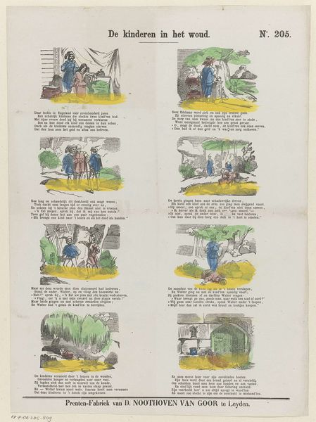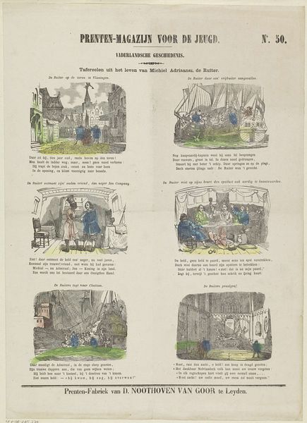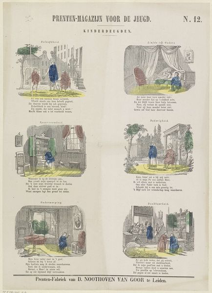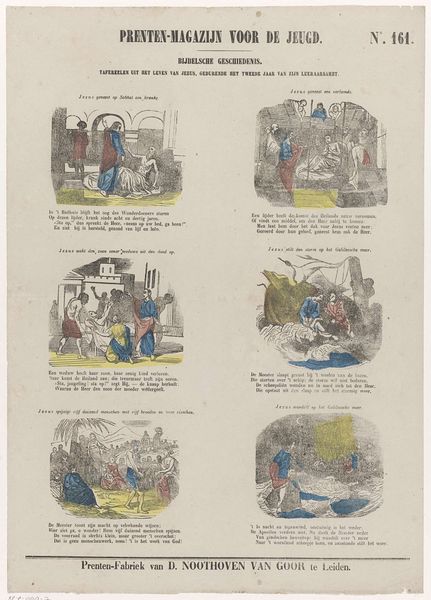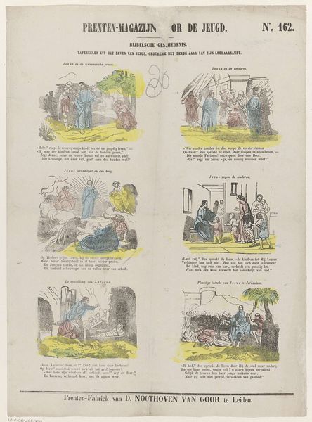 This print, titled 'Tafereelen uit het leven van den profeet Daniël' or 'Scenes from the Life of the Prophet Daniel', was made by Dirk Noothoven van Goor using an engraving technique with added colour. The piece is divided into six panels, each depicting a scene from the biblical story of Daniel. The composition uses simple lines and flat areas of colour to create a clear narrative sequence, reminiscent of early comic strips. The print's structure invites us to consider how each panel functions as a visual signifier. Notice how the artist employs consistent visual motifs, such as Daniel's distinctive robe, to maintain continuity across different scenes. The limited colour palette, dominated by earth tones and muted blues, unifies the composition while subtly emphasizing the emotional tone of each event. The sequential arrangement reflects a broader cultural interest in linear narrative and moral instruction. Consider the function of the artwork as a whole. It acts as a cultural artifact that utilizes its formal elements to engage with religious themes. This narrative sequence is not just a series of images but a structured argument about faith, resilience, and divine intervention.