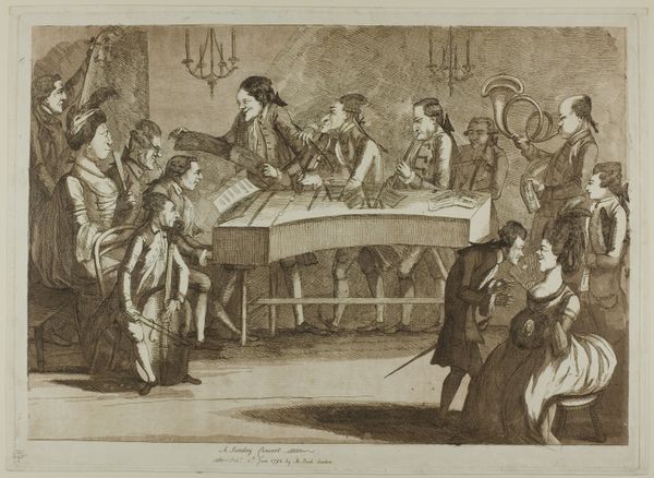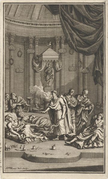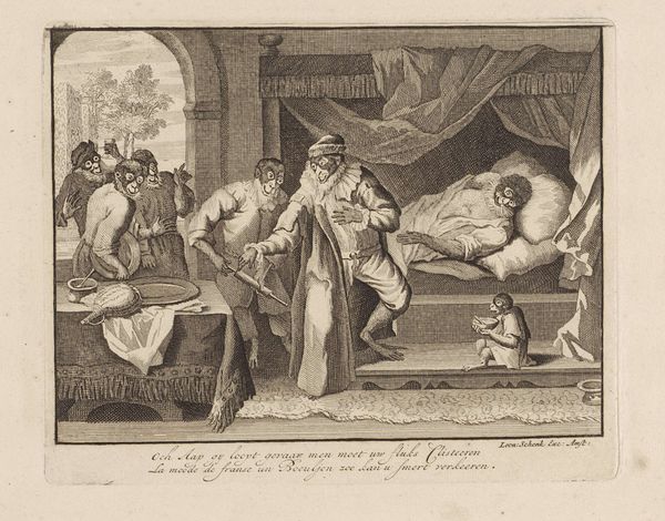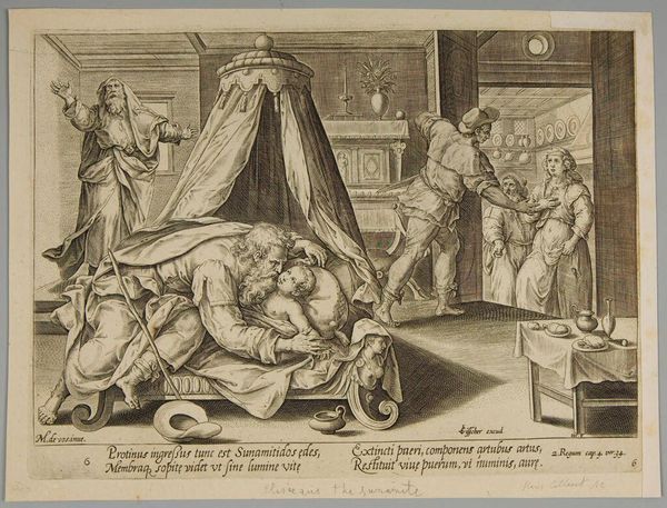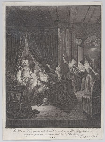 Cornelis Galle I created this engraving titled "Slapeloze nachten voor de aanklager" with a technique that captures intricate details through line and shadow. The monochrome palette accentuates the narrative's somber mood, focusing on the interplay between light and darkness. The composition is divided into distinct zones: a figure resting in bed, central figures disrupting the peace with a torch, and other figures being ushered away, all meticulously detailed to draw the eye across the scene. The symbolic elements, such as the rooster, bat, and implements of justice, invite semiotic interpretations of wakefulness and the disruption of sleep. Through structured design, Galle prompts us to contemplate the narrative's historical and cultural context. Galle uses formal qualities to suggest deeper meanings about justice and internal unrest. The artwork's enduring relevance lies in its ability to inspire ongoing reflection, as we continuously reconsider our interpretations of art and life.
