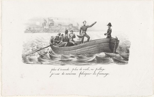 Curator: This engraving, titled "Jan Bart escaping from an English prison and crossing the Channel by rowboat, 1689," was created by Yves Marie Le Gouaz in 1806. The scene depicts a dramatic escape by sea. Editor: Immediately striking is the starkness, that monochromatic palette. It feels raw and precarious; the small boat practically swallowed by the choppy sea. The use of line to create texture, particularly in the water, is quite compelling. Curator: It's a fine example of narrative art, and the print medium here underscores its role in disseminating stories of national heroes, particularly at the beginning of the 19th century. Consider the socio-political landscape – France still reeling from revolution, and the importance of constructing national identity. Editor: True, but let's not ignore the formal devices. The artist uses the curving lines of the waves to draw your eye towards the boat, effectively staging the human drama against this formidable backdrop of nature. I wonder how that baroque aesthetic affected this print. The strong diagonals and dynamic composition certainly add to the drama. Curator: We can look at the material production – engraving being a relatively accessible medium meant these heroic narratives could reach a wider audience. Prints like these fed a demand, they served a function in bolstering patriotic sentiment. What labor was involved, what paper was used, and how the print circulated are vital considerations. Editor: Perhaps, but doesn't focusing solely on production and reception detract from the visual experience itself? Notice how the engraver renders the figures, each face etched with determination – a subtle play of light and shadow creating a sense of depth despite the linear quality of the engraving. That's visual rhetoric, right there! Curator: Agreed; but who was this Bart, anyway? To understand the emotional resonance of this image, it's essential to unpack who he represents in the French imagination and how that was strategically shaped and communicated at the time by this piece. Editor: Point taken. So, we have the formal arrangement conveying danger and resolution, a moment framed through careful arrangement of line and form, against the broader context of nation-building through accessible artworks. Curator: Precisely. It’s more than just the strokes of the tool; it’s the swell of a nation's collective ambitions reproduced on paper for mass consumption. Editor: And a compelling little drama told efficiently and powerfully, no less.
