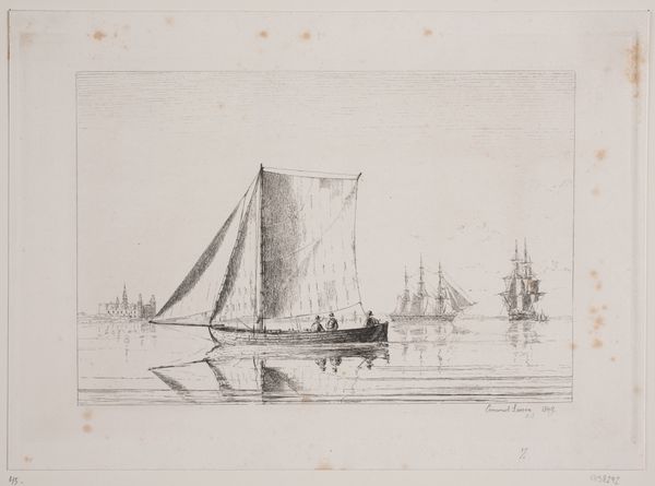 Curator: Welcome. We are looking at "En kuf i stille vejr" by Anton Melbye, created in 1841. It's an engraving on paper. Editor: It’s striking how tranquil it feels, almost dreamlike. The ships seem to be gliding, suspended in a hazy atmosphere. Curator: Indeed. Melbye was part of the Romanticism movement, and that comes through strongly in the portrayal of nature's sublime tranquility. These maritime scenes, particularly in a place like Denmark, carried immense symbolic weight, didn’t they? The sea was the primary connection to the outside world. Editor: Absolutely. Ships, in themselves, held symbolic power as vehicles of exploration, trade, and sometimes, conquest. But notice the stillness in the air, the calmness of the water – it suggests a period of peace, perhaps reflecting the stability that Denmark sought during that era. The repetition of the ship image receding into the background certainly resonates. Curator: It is subtle but ever-present commentary. The artist uses delicate lines to depict the sails, almost whispering the wind. One must consider class and the access to travel and resources that defined 19th-century seafaring. These weren't just boats, but tools and spaces of empire, trade, colonialism. Editor: Yes, it's easy to romanticize these images, forgetting the realities of life at sea for the crew or overlooking the social and political agendas. The ship, therefore, morphs into a symbol of power and control. Consider the sparseness of detail, almost washed away, which reinforces that detachment. Curator: Right, the atmospheric perspective employed is amazing here. The farther ships practically dissolve, underscoring the vastness and limitlessness of the sea as a metaphor. Editor: Well, considering all its layers of meaning, this deceptively simple scene really has spoken volumes. Curator: I agree; it underscores art's capacity to hold quiet conversations with history, power, and culture.