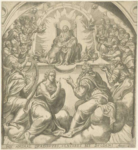 This is Giovanni Jacopo Caraglio’s engraving, “Outpouring of the Holy Spirit." Made in the 16th century, this piece reflects the religious and social tensions brewing during the Reformation. Caraglio, an Italian artist, navigated a world where religious dogma was law. Here, he presents a classic biblical scene, but it's not just a straightforward depiction. Look at how the figures react to the divine light – a mix of awe, submission, and perhaps even fear. This emotional complexity invites us to consider the personal impact of faith. What does it mean to be chosen, to be filled with divine power, especially in a time of religious upheaval? The presence of both men and women receiving the Holy Spirit could signal a subtle commentary on inclusivity or perhaps a reflection of the communal religious experiences. The image encourages us to consider the transformative power of collective belief and personal conviction during times of uncertainty.