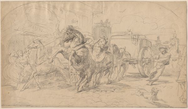 Curator: Here we have Théodore Géricault's "Coal Wagon Hauled by Seven Horses." It's a delicate watercolor and pencil drawing at the Harvard Art Museums. Editor: It certainly evokes a feeling of burden, doesn't it? All that weight, the muted tones, the way the horses strain... Curator: Absolutely. Géricault was deeply affected by the plight of the working class. This piece, though a quick sketch, speaks volumes about the socio-economic realities of his time. The horses become symbols of exploited labor. Editor: And consider the wagon itself. It looms large, almost obscuring the figures. It’s a symbol of industry, but also of the forces controlling their lives. Curator: Exactly, the drawing really resonates with feminist readings of labor where issues of representation and visibility are really brought to the forefront. Editor: Looking at it now, the muted palette and the sheer number of horses really amplify the sense of relentless labor, even now. Curator: It's a small sketch, but it contains so much about the power dynamics of the 19th century. Editor: Indeed, it makes you reflect on how symbols can still provoke feeling generations later.