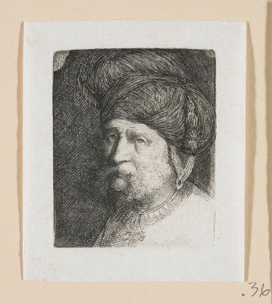Curator: Here we have Pieter Casteleyn's 1653 engraving, "Portret van tsaar Michaël Fjodorovitsj Romanov"—a portrait of Tsar Michael of Russia. Editor: My first thought is the intriguing contrast of textures—the soft, flowing lines of his turban versus the rigid, diamond-shaped frame. There's a formality, almost austerity, communicated through these juxtaposed visual elements. Curator: Absolutely. Casteleyn’s engraving technique relies on strong lines and hatching to build form and volume. The stark contrast emphasizes the Tsar’s regal bearing. Note also the use of the lozenge to suggest a window or portal to the subject. Editor: That window metaphor is intriguing. Looking closely, I see a man caught between worlds—the exotic East implied by his headdress, versus the European expectations of monarchy communicated through the very baroque sensibility of the rendering. The eyes, with their intense gaze, seem to hold some burden of reconciling those tensions. Curator: That tension, I believe, exists within the technical elements as well. The line quality varies significantly throughout the portrait; softer, more atmospheric marks render the turban, while more rigid parallel marks sculpt the face. It lends a complexity to what at first appears to be a fairly straightforward portrait. Editor: Indeed. Beyond the formal composition, the very act of depicting this Tsar in such a manner signifies a bridging of cultures, a European fascination, perhaps, with the exotic other. What was Casteleyn’s cultural lens? Curator: The inscription below, stating Casteleyn's Haarlem origin, might imply an active Northern European merchant culture keen to record, document, or translate other cultures through the reproducible format of printmaking. Editor: So, in essence, the symbolism lies not only in what is represented but also in the act of representation itself, suggesting the dynamics of cultural exchange during the Baroque era. Curator: Precisely. It brings forth the notion of the artistic construction of the sitter and his cultural persona for distant viewership. Editor: This little print suddenly unveils larger perspectives than its size suggests. Thank you. Curator: It has been my pleasure. A deceptively complex image of cultural politics made accessible.