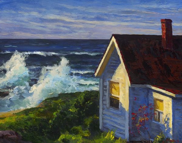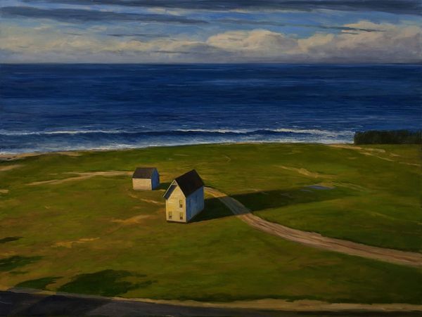 Curator: Standing before us is Mark Beck’s “Rising Tide,” a captivating oil painting executed in a plein-air style. It features a classic seascape and an arresting display of coastal architecture. Editor: My first impression? There's something both inviting and isolating about this composition. The crisp details of the buildings pull you in, while the immensity of the water around them evokes a sense of being cut off from the world. Curator: I see the symbolism playing out across the scene. Notice how the light and shadows carve a path towards that distant structure, a visual motif of yearning. Also, water signifies change, life, and unconsciousness—"Rising Tide" certainly seems to be hinting towards some inner world transformation. Editor: I wonder, what was it like to display paintings like this to the wider public? To many city dwellers, this would have represented the idealized escape into a simpler, more organic existence away from crowded city centers. I feel it is the archetypal lonely house on the coast, facing something big alone. Curator: That contrast is important. These remote dwellings often held deeply spiritual connotations. Thinkers sought nature's sublime power, the transcendental experience available outside societal strictures. The artist offers not just a visual document, but almost a devotional experience. Editor: Exactly! Beck is playing with very specific expectations of painting; landscape in general can offer catharsis and be seen as almost a form of propaganda. We see the role that idealized depictions of simple coastal life play in broader social dialogues about nature and industry. The politics of art! Curator: Precisely. Viewing art like "Rising Tide" gives us the ability to tap into something universal, and remember that continuity over time. I mean, people were striving to understand nature through art hundreds of years ago, and will be for hundreds of years into the future! Editor: For sure, I leave feeling reflective about the impact of historical memory on even modern and seemingly benign seascapes, and just how those long-lost historical associations linger to shape our own perceptions and responses.