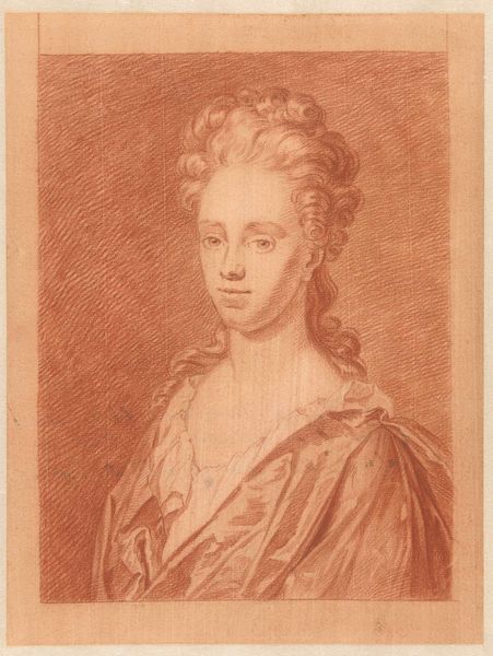 Curator: Looking at this pencil drawing by Aert Schouman from the 18th century, "Portret van Wilhelmina Frederica Sophia van Pruisen," I am struck by its quietness, almost a ghostly presence captured in these delicate lines. Editor: The ghostly quality is right – the grey paper substrate speaks loudly about the drawing's process, the scraping, the layering to reach that spectral tonality. I think of the powdered graphite traveling between the artist's fingers, leaving these barely-there traces… It’s interesting that graphite only started gaining in quality around 1750, while this drawing comes from around the same period, which might speak about the limited access to materials. Curator: Precisely. Observe the economical yet incredibly precise hatching, especially around the facial features. The rendering creates volume, communicating her regal bearing. Consider how the linear construction of her attire juxtaposes beautifully with the ethereal curls. Note, as well, how the strategic use of minimal color calls attention to her regal persona. Editor: Yes, and that "strategic use of minimal color," or rather, the subtle indication of a textile texture with red chalk around the collar… that signals opulence and labor investment even without intricate detail. You almost feel the cost in human hours within these small touches. It makes you reflect on how social and political standings affect access to both material and opportunity. Curator: Indeed, the textural implications support the context of its production, which reflects her position in society. And I also appreciate the very conscious balance between defined contour and softer modeling... There's something truly remarkable about Schouman's ability to elicit so much presence using seemingly so little. Editor: Exactly – the minimal execution amplifies my perception of labor division and privilege as its framework and key ingredient. Overall, thinking about how labor manifests in visual representation and also conditions our viewing of historical portraiture feels enriching.