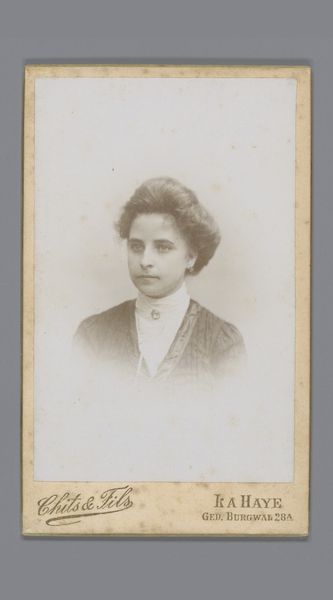 Editor: This photographic print, "Portret van een onbekende jonge vrouw" by Alexandre Sage, dates from the early 1900s. There's a formal, almost stoic feel to this young woman's portrait. It definitely makes you wonder about her social standing. What do you see when you look at this image? Curator: It's fascinating to consider this portrait within the broader context of photographic portraiture at the turn of the century. Photography became increasingly accessible to the middle class, shifting portraiture's representation from solely commemorating nobility and the elite to depicting a more diverse range of social identities. Who had access to this type of portraiture, and what did that signify? Editor: That's interesting. I hadn't considered it in terms of social accessibility. So, this woman having her portrait taken indicates something about her place in society? Curator: Exactly. Consider the rise of impressionism and its impact on photography. While the style influenced painting through an emphasis on light and personal perception, portrait photography began fulfilling different social purposes and reaching broader audiences than painted portraits could. In a society then, concerned with scientific accuracy and record-keeping, photography democratized representation. Does this change your reading of the image at all? Editor: Yes, thinking about the social impact makes the image feel less about individual expression and more about societal trends. Like it tells you something about Lyon's society. Curator: Precisely! And even the photographer’s placement of their studio name on the photograph contributes, making this print into both artwork and advertisement. Understanding these details unlocks deeper stories. Editor: I learned a lot by looking at the artwork in a wider, socio-historical perspective. It goes beyond the surface, making it a much more rich experience. Curator: Indeed. Analyzing the artwork this way really enhances the viewing and interpretation process!