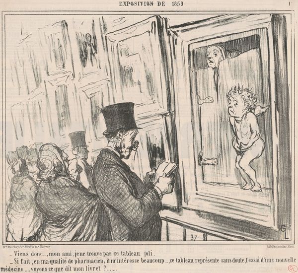 Curator: Oh, goodness, what a wonderfully sardonic piece! Daumier never ceases to make me smile. Editor: It’s interesting that you say that—to me, this lithograph presents a potent commentary on societal attitudes toward childhood and medical experimentation. Curator: Indeed! Daumier's "Let's go..., my friend, I do not find this painting pretty..." captures a visit to an exhibition, and the viewer’s comment is part of the caption. Editor: Right. It highlights the discomfort and perhaps the exploitation inherent in turning vulnerable subjects into objects of spectacle, particularly within the context of scientific advancement. Curator: Oh, absolutely. But also, doesn't it just speak to the inherent oddness of art itself, this constant dissection and analysis? Editor: Perhaps. But for me, it also serves as a crucial reminder to critically examine the power dynamics embedded within supposedly objective forms of knowledge and representation. Curator: Ah, well, Daumier always gives us something to chew on, doesn't he? Editor: Precisely. It challenges us to confront uncomfortable truths about our own gaze.