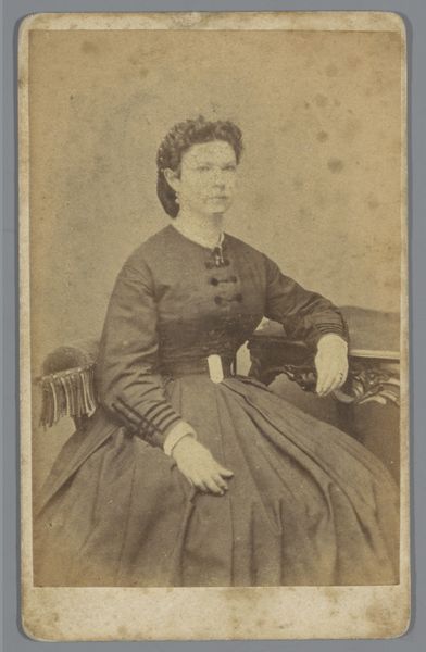 Editor: Here we have a photograph entitled "Portret van een onbekende vrouw," made sometime between 1863 and 1880 by Jan Hendrik Garlinck. The sepia tone gives it such a timeless feel, but it also mutes so many details... What strikes you most when you look at the formal composition of this piece? Curator: What fascinates me immediately is the interplay of light and shadow across the sitter's dress. Notice how the garment's folds are meticulously rendered through tonal variation. It's a study in texture using light, isn't it? Consider also the framing; it's a conventional portrait setup. What purpose does that serve? Editor: It seems to isolate her, make her the sole subject of our analysis. The simplicity throws all the attention on her posture, dress, and face. It really encourages you to focus on details of form. I initially missed all the button detailing. Curator: Precisely! Now consider the gaze; the woman's averted eyes combined with that small, almost negligible, point of specular highlight on her forehead... There is a curious blend of detachment and a very pointed... acceptance. Does it make you wonder what internal state Garlinck was trying to capture through those formal decisions? Editor: Yes, now I wonder if I jumped too fast in judging the aesthetic! Focusing on the details of photographic craft and intention changes my appreciation for what is on display. Curator: It's through close, structured analysis that one begins to unlock these visual texts! A valuable exercise, indeed.