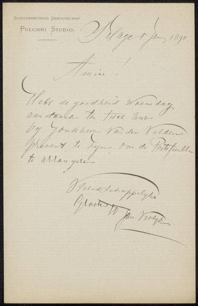 This is Jozef Israëls' "Brief aan Frans Buffa en Zonen", created with ink on paper. The letter presents an intimate glimpse into the artist's world through its handwritten form. The composition is dominated by the stark contrast between the pale paper and the dark ink, which creates a visual hierarchy, drawing our eye to the script. The looping and cursive lines of Israëls' handwriting present a tension between legibility and abstraction. Each word, each stroke, is a signifier, yet the overall effect transcends mere communication. The letterform creates a rhythm across the page, almost musical in its flow. Consider how the materiality of the paper interacts with the ink. The absorbency of the paper influences the spread of the ink, creating subtle variations in line weight and texture. This interplay adds depth and complexity to the surface, inviting closer inspection. The structure reflects a dialogue between intention and execution, revealing a narrative beyond the literal content of the letter.