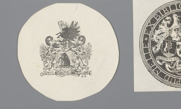 Curator: Welcome. Before us is a bookplate—"Ex libris van Hetty S.M.J.C. Cornets de Groot"—created sometime between 1886 and 1948. It’s an engraving, so rendered with sharp lines, and given its purpose, undoubtedly small in scale. Editor: It’s like a tiny heraldic puzzle! So dense with symbolism and tightly arranged; it creates a feeling of constrained elegance. I imagine it adhered inside the cover of some treasured volume. Curator: Indeed. Notice the strong symmetry first—a kind of radial balance spinning out from the central coat of arms. The line work is impeccable, defining the shapes clearly and concisely. The entire design is cleverly contained within a quatrefoil, like a stylized four-leaf clover. Editor: That central heraldic shield immediately draws the eye. Above it, there is what appears to be a crown; beneath the shield, something serpent-like...The words "Hora Ruit" give it the air of a family crest with motto meant to deliver both authority and a coded message. I want to decipher it all! Curator: Observe how the surrounding text reinforces the geometric design. “Ex Libris” mirrors “De Groot” and “Hetty S.M.J.C. Cornets” balances it across the top, all conforming to the containing shape. There's a wonderful interplay between positive and negative space. Editor: The personal nature of a bookplate—to stake a claim on knowledge—is what I find so captivating. This image of intertwined personal history with those abstract claims on higher knowledge would personalize the owner's whole library. It's all incredibly powerful to the owner of such treasures. Curator: Precisely. By focusing on form, composition, and technique, we can better appreciate the refined nature of such small, printed art. It also shows us the evolution of graphic art to convey information. Editor: Yes! The piece allows us to peer into Hetty’s world. Symbols of lineage and knowledge offer hints about social standing and personal values in past worlds. Curator: It's a fascinating look into how printed imagery and language work to inform its users—and how that practice impacts all fields, up to the modern day. Editor: Exactly. Visual culture echoes and evolves. That this "Ex Libris" allows to witness just a snippet of that makes it beautiful to me.