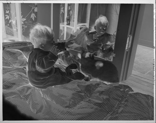 Curator: This evocative, though untitled, photo by Lucian and Mary Brown depicts a girl by a window surrounded by her dolls. It’s a small gelatin silver print, only about 4 by 5 inches. Editor: The first thing that strikes me is how the window acts as a second plane—a world within a world—and, of course, the dolls! They're not just toys; they are a child's first society. Curator: Exactly, and the materiality of the image itself—the gelatin silver—adds to the sense of a fleeting moment captured, almost ghostly, reflecting the ephemeral nature of childhood. It also feels quite staged, doesn’t it? Editor: Yes, it invites speculation—who made the dolls? Where did the fabric come from? Each stitch tells a story of labor and affection. It's a quiet commentary on domesticity. Curator: Perhaps it’s a peek into a shared universe, crafted with love, and imprinted in silver. Editor: Indeed, material and memory intertwined.
