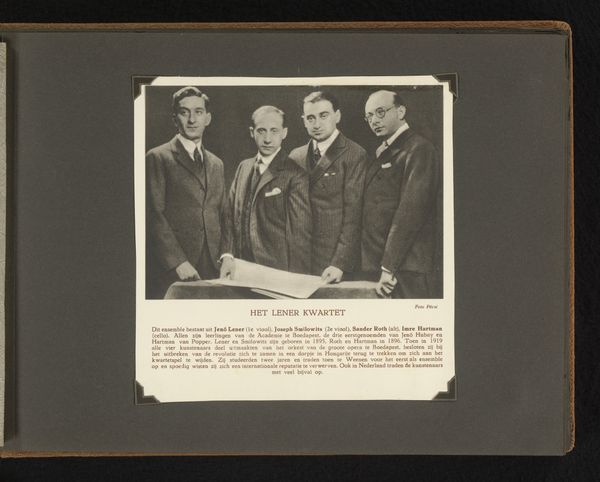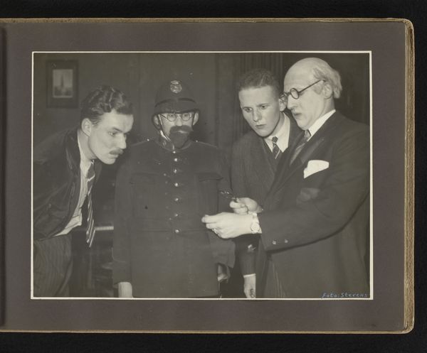 Curator: Let's look at this photograph, "Een scène uit het toneelstuk 'Wat Jonas overkwam'," possibly from 1936, attributed to Fotobureau Stevens. What strikes you initially? Editor: There's a strange tension, like everyone is frozen mid-gesture. The contrast between the smooth, almost waxy faces and the backdrop's rough texture also draws the eye. Curator: It’s interesting you notice the tension. Considering its title refers to a play, it highlights performativity and societal expectations around gender. Look at the women on either side; they're framed almost as supporters or even constraints on the men. Editor: The photograph feels very posed, very deliberately arranged. I’m curious about the materiality, the photographic paper itself. It seems like a straightforward print, maybe contact paper. But think of the labour – from the posing, directing to the actual processing in the darkroom – a craft itself. Curator: Exactly, and let's not overlook the socio-political undertones. The photograph potentially captured during a period of immense change and turmoil across Europe—how could such political dimensions influence this scene, in particular, shaping performance and stagecraft? The men's attire and handshake, potentially symbolising solidarity or perhaps even discord, speak to something deeper. Editor: What is intriguing, from a material standpoint, is how ephemeral the theater is by its very nature but made archival and preservable through photographic medium. Photography allows a fleeting moment to be studied, assessed in different historical settings in future times. What does the play then have to tell in the material context of our current times? Curator: By looking at the photograph, we see an invitation to dissect how performance intersects with broader societal dynamics. A captured slice of past dialogue, influencing dialogue of today. Editor: Absolutely. The medium's capacity to outlive performance, altering meanings, and our interaction through history with labor, time, and political landscape – an image like this gives us much to think about!