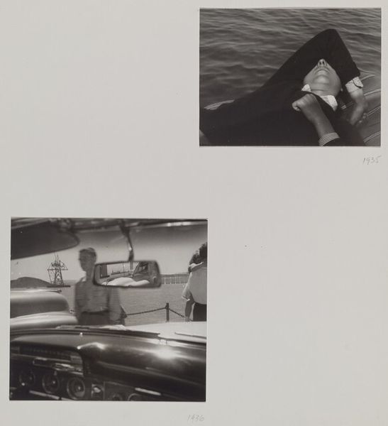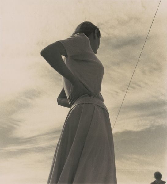 Editor: This is "Jones Beach" by Elaine Mayes, a gelatin silver print. It feels very stark, almost desolate. What can you tell me about it? Curator: Look closely at the figure and the metal detector. Consider the labor involved in searching a beach, sifting through sand. What is being sought, and what does that labor signify in our culture of consumption? Editor: So, it's about the work and what we value, not just a day at the beach? Curator: Precisely. Think about the materials used – the metal, the photographic chemicals, the paper. How do these elements contribute to the meaning of the work, reflecting both industry and individual effort? Editor: That’s a totally different way to look at it. Thanks! Curator: My pleasure. It's all about seeing the unseen processes.