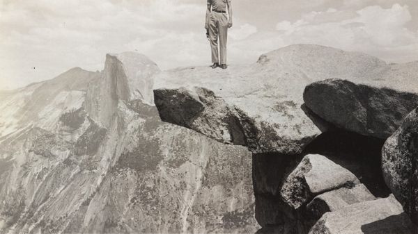 Curator: Looking at Eugène Cuvelier’s "Gorges de Franchard – Fontainebleau Forest," created around 1860 using a gelatin silver print, I'm immediately struck by the rather gloomy, even monumental feel of this landscape. Editor: Yes, it definitely feels weighted. Those heavy, brooding rocks dwarf the figure on the summit. It's as if the landscape itself is a character, a stoic giant. The lone figure, a tiny speck, really drives home that feeling of insignificance. The human confronting the vastness, the unyielding presence of nature. It whispers romantic ideals. Curator: Absolutely. Cuvelier, working in that Realist-Romantic cusp, often captured the raw grandeur of Fontainebleau. It's fascinating how the photograph transforms the forest into something almost primeval. Do you get a sense that he wants us to question the relationship between humanity and the overwhelming scale of nature? Editor: I see symbols layered one atop another. The climb to the top, maybe a pilgrimage to higher insight, wisdom? Yet the path looks difficult, full of struggle; light and shadows intermix with shapes that remind me of skulls. I cannot look away. What do you read in it? Curator: It feels elemental, primordial, doesn’t it? It invites us to imagine our place, quite tentatively, against its rocky, mossy bulk. Editor: The light and shadows, the gray scale, become like a map of past struggles—histories embedded into each stratum. He is more a part of the land and its deep history than the beginning of any climb to master it. Curator: He has to submit, right? Surrender to it completely and forever, I suppose. Editor: Which brings us to the cultural symbolism of forests in general – places of fairytale danger but also profound, introspective, imaginative possibility. And this picture somehow manages to hint at it all, through that play of light, and dark and resolute figure, as he almost vanishes into landscape. Curator: Right—vanishing is maybe exactly right, it could take one’s breath away, thinking about that moment of pure presence! I feel as though Cuvelier wasn’t just documenting a landscape; he was pointing us to the profound depth it could inspire in each one of us. Editor: Indeed, a space in which symbols echo across history—nature becoming a hall of mirrors where humans face, and slowly become, echoes of themselves. A space to imagine new folklore and fairytales.