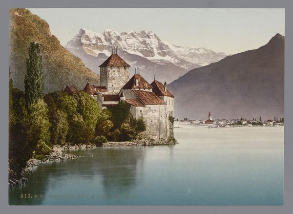 Curator: Here we have an intriguing photographic print titled "Gezicht op \u00cele de Salagnon in het Meer van Gen\u00e8ve, op de achtergrond de Dents du Midi"—or, "View of the \u00cele de Salagnon in Lake Geneva, with the Dents du Midi in the background." The anonymous artist likely captured this scene sometime between 1889 and 1920, working en plein-air. What are your first impressions? Editor: What strikes me is the dreamy isolation. It feels suspended in time, this little island and its elegant villa. There’s a fairytale quality to it, almost like a mirage rising out of the water. That crystalline reflection just adds to the magic. Curator: Yes, it possesses that captivating allure. Notice how the artist juxtaposes the natural, almost untamed, backdrop of the Dents du Midi mountains with the rigid geometry of the villa. The island, framed by the Alps, becomes a symbol of cultivated serenity, an almost classical ideal of retreat from the world. It really speaks to a deep-seated longing for order amidst chaos. Editor: Exactly! That building is all clean lines and right angles, practically screaming "control", compared to the wild, snowy peaks. It’s like a little bastion of civilization holding its own. Do you think it speaks to ideas about paradise, some Eden reimagined for the modern era? Curator: Possibly. Water, islands, and enclosed gardens all resonate with archetypal images of paradise and sanctuary. The photograph presents a narrative, one of man's desire to create a perfect, self-contained world within nature, mirroring the Garden of Eden. I can almost see a late romantic painting tradition at play in photographic form, the sublime natural vista serving as a mirror for internal reflection. Editor: Well, it worked. Looking at that shimmering reflection, I find myself wanting to jump right into that tranquil water and escape into my own idyllic, water-bound kingdom. The allure of this image is strong, wouldn't you say? Curator: Absolutely, and its enduring power, stemming from artful composition and the resonance of timeless symbols, reveals something profound about our collective desire for tranquility and escape. Editor: I'll second that sentiment. A little piece of stillness and escapism, delivered straight to the eye. Quite a captivating gem!