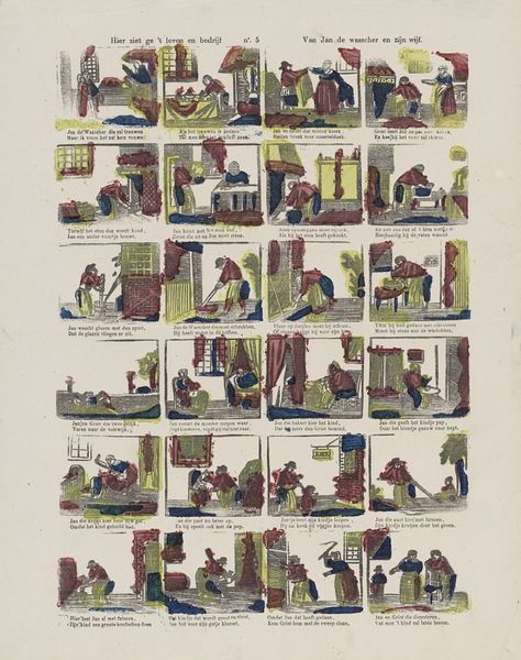 Curator: Here we have an intriguing print dating from 1848 to 1881, attributed to Lutkie & Cranenburg and currently residing in the Rijksmuseum. Its lengthy title translates to something like, "What Mother Goose Tells, you see this picture, / How Cinderella went to marry a prince. / And how a cunning cat, through tricks finely devised, / Has brought her poor master to high rank." Editor: It looks like a storyboard! The style is loose, sketch-like. And it looks almost hand-colored. The lines are coarse, but I'm drawn in immediately by the naive perspective and the restricted palette. Curator: Exactly! Notice how the artist condenses multiple narratives into a single page, like a visual summary of familiar tales. Each panel serves as a miniature stage, complete with its own set of symbolic actors and settings. Consider, for example, how Cinderella, in her rags, embodies the potential for transformation and social mobility. Editor: Right. The "poor master" elevated by his clever cat – a commentary on labor and social mobility? Were these intended for a working class audience or consumption by the rising bourgeois who identified with characters successfully climbing the ranks? It makes you wonder who printed it and under what conditions, what kinds of pigments are they using and what paper and how were these books distributed and sold. Were children supposed to learn these stories by viewing these printed materials? Curator: I believe these kinds of prints served various didactic purposes. Fairy tales aren't just entertainment; they're cultural scripts, imparting morals and values about social conduct, gender roles, and even political ideology. Note also the windmill motif. This suggests an aspiration or commentary related to the Netherlands in the time it was made, perhaps about its agricultural resources or self-reliance. Editor: All valid. But look closely at the materials; the textures! It almost feels folk-art or even craft rather than "high art" due to those material and manufacturing elements. It really straddles that border. Curator: Perhaps. This print speaks volumes about the symbolic language embedded within popular culture, even back then. Editor: Agreed. Looking at it through a lens of production, of printing methods, tells its own story as well. Fascinating, the things an image can convey.