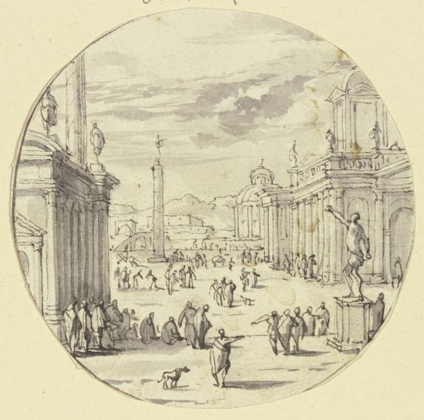 Abraham Storck the Elder created this drawing of a "Seaport with a Fountain and a Column" with pen and gray ink. It evokes a sense of bustling activity and classical grandeur. The composition is structured by receding planes, from the foreground figures unloading goods to the distant, columned cityscape. Storck employs line and form to establish a hierarchy. Strong vertical elements like the column and ship masts contrast with the horizontal spread of the harbor, creating a balanced, yet dynamic scene. Here, we can see the semiotic interplay between labor and leisure. The fountain and imposing architecture signify civic pride and order, while the laborers signal the economic engine driving the city. Storck presents a vision of harmony and prosperity. However, these elements challenge fixed meanings. The detailed portrayal of labor challenges any simplistic reading. It suggests the foundational role of everyday activities in supporting cultural achievement. The drawing functions as a cultural document, showing how artistic forms articulate and negotiate complex social values.