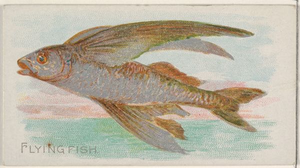 Editor: So this is "Carp" from the Fish from American Waters series by Allen & Ginter, dating back to 1889. It's a print with coloured pencil, and I'm immediately drawn to how… flat it seems, almost like a woodblock print, even though the pencils give it some texture. What strikes you about it? Curator: I see the print first and foremost as a commodity object, not fine art. We must consider its context: trade cards packaged with cigarettes. This tells us about 19th-century advertising, consumer culture, and even the dissemination of visual information before mass media. Note the choice of "American Waters." What does this emphasis on locality signify, when exotic influences from the Ukiyo-e style are undeniable? Editor: That's a good point. The composition and subject matter definitely recall Japanese prints. I see what you mean about it being a commodity - something meant to be collected and traded. How does the medium choice fit into that? Curator: Precisely! The coloured pencil, readily mass-produced, becomes essential to its function. What boundaries does it challenge, if any? Editor: I guess I always separated mass produced print from art, but here they mingle together…It also challenges the boundary between science illustration and… well, marketing! I didn’t expect that. Curator: Exactly. Now you're seeing how the seemingly simple choice of medium and context opens up questions about labor, distribution, and the perceived hierarchy of art forms. This print serves to document the “American Waters” but its main purpose was really commercial. Editor: This makes me think differently about everyday images – everything has a purpose and says a lot about our consumer society. Curator: Indeed. By looking at its materiality and means of production, we gain a deeper understanding of the world this image inhabited.