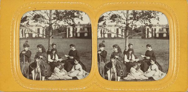 Editor: This is "Gezelschap in bos," a photograph by Jules Marinier, likely created between 1864 and 1880. It presents a group of people gathered outdoors, and there's something staged about it, like they’re performing for the camera rather than genuinely relaxing. What historical context helps us interpret this kind of staged informality? Curator: That’s an interesting point. Group photography in the 19th century wasn’t just about documentation; it was also a performance of social status. These genre scenes, set in an idealized 'nature', speak to a growing bourgeois desire to display leisure and family values. How do you think the new availability of photography at the time impacted artistic and social conventions? Editor: I imagine it democratized portraiture to some extent, even if it was still an elaborate process. This particular image looks like a stereo card. It's presented as two identical images to create a sense of depth when viewed through a stereoscope. This reinforces that these images were objects of mass consumption rather than singular artworks, right? Curator: Precisely. These stereo cards were hugely popular, bringing three-dimensional images into middle-class homes, effectively turning everyone into art collectors. Consider the act of viewing: families would gather to view these images, fostering a shared experience. Think about how photography impacted the role of paintings. Genre paintings might be interpreted differently as people got more used to photography. How might paintings evolve in the context of widespread access to photography? Editor: That's a really great point! Maybe the paintings move further away from representing reality literally because they are more focused on emotions. The relationship between the rise of photography and, for example, impressionism, could then be related to an evolution in art's goal due to shifts in cultural consumption, especially concerning representation! Thank you. Curator: Exactly. So, what appeared to be a simple domestic photo ends up mirroring societal shifts and cultural transformations through its very existence and means of distribution. It underscores the complex interaction of art and public life during the period. It really allows us to look into the context of our society through photography!